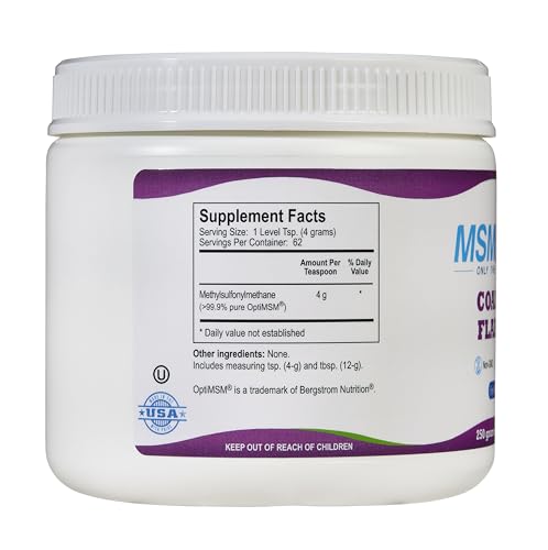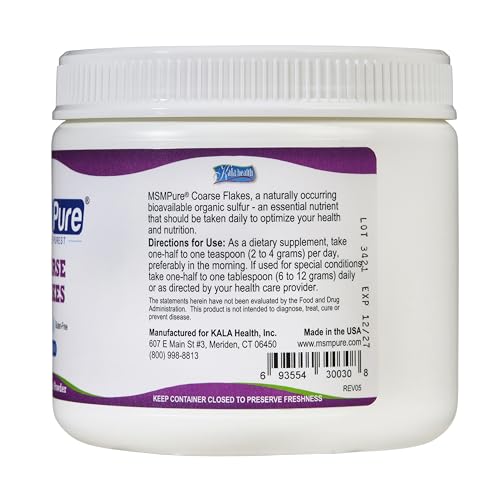 KALA HEALTH MSMPure MSM – 8.8 oz Coarse Powder Flakes, 99.9% Pure Distilled Organic Sulfur Crystals é um produto de alta qualidade que oferece diversos benefícios para a saúde das articulações e da pele. Com sua fórmula concentrada de MSM, este suplemento é reconhecido por promover a produção de colágeno e apoiar a formação de cartilagem, o que pode reduzir o desconforto nas articulações e melhorar a mobilidade.