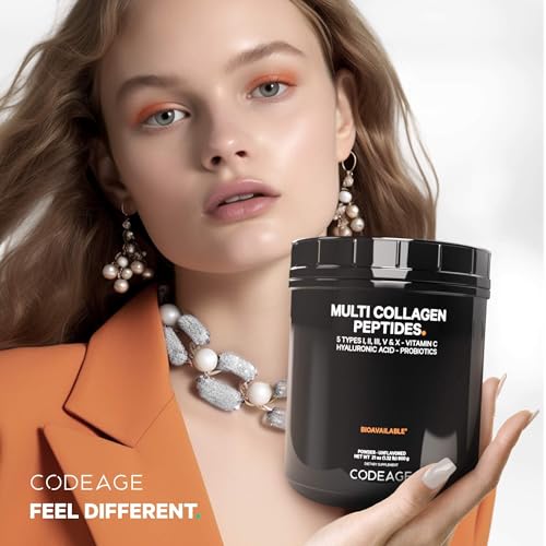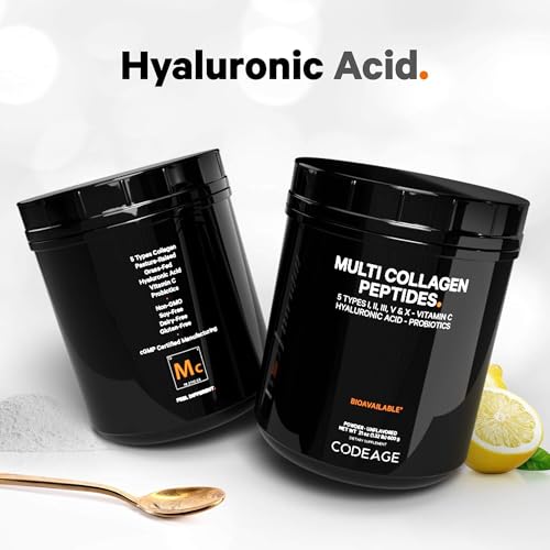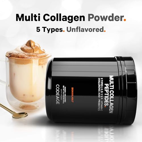 O Codeage Multi Collagen Peptides Probiotics Black Edition é um suplemento em pó completo de colágeno que inclui uma combinação de peptídeos de colágeno com ácido hialurônico, vitamina C e probióticos em uma única solução nutricional em pó de colágeno para mulheres e homens.