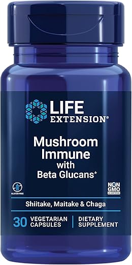 Life Extension Mushroom Immune with Beta Glucans é um suplemento alimentar formulado para promover uma resposta imunológica saudável. Este produto combina os benefícios de cogumelos como shiitake, maitake e chaga, conhecidos por suas propriedades de suporte imunológico. Esses cogumelos são renomados por sua capacidade de estimular a resposta imunológica do corpo a uma variedade de desafios.