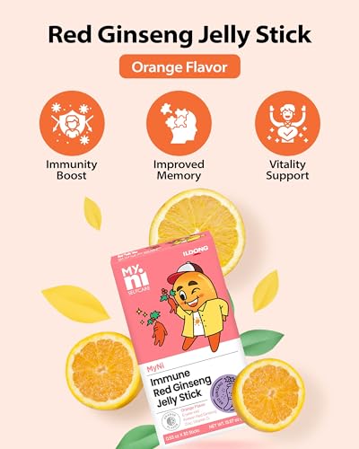 MYNI IMMUNE RED GINSENG JELLY STICK, ORANGE FLAVOR (15g/0.5oz x 30 sticks) – Eleve a saúde do seu filho com o Immune Red Ginseng da MyNi, fornecendo 30 sticks convenientes para serem consumidos durante 15 dias. Infundidos com autêntico ginseng vermelho coreano de 6 anos, vitaminas e minerais, esses sticks de gelatina são uma adição saborosa e eficiente à rotina diária do seu filho. Disponível em 2 sabores deliciosos – laranja cítrica e manga doce.