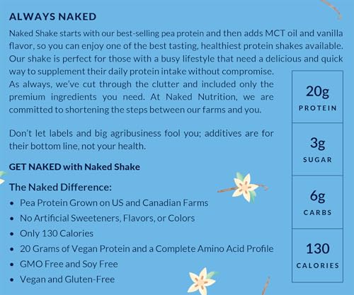 Cada porção do Naked Shake contém 20g de proteína, apenas 3g de açúcar, 6g de carboidratos e 130 calorias. Além disso, é livre de laticínios, vegano e feito a partir de ervilhas amarelas cultivadas nos EUA e Canadá. Sua fórmula exclusiva oferece um perfil completo de aminoácidos, garantindo uma fonte de proteína de alta qualidade.