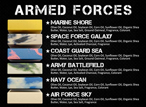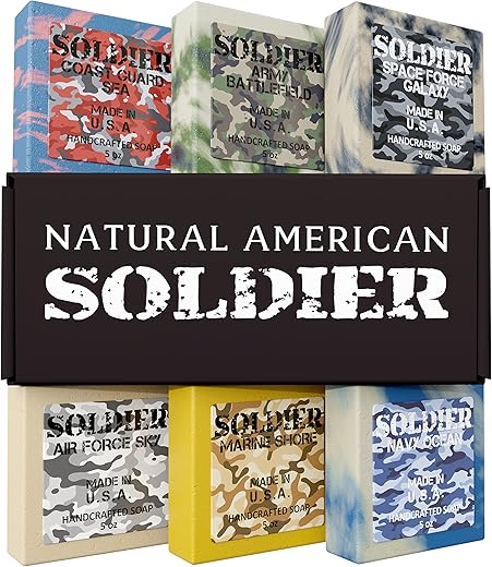 O kit inclui seis barras de sabonete SOLDIER de 5 oz cada. Garantimos que a experiência com este sabonete masculino natural será encantadora. Cada barra simboliza um ramo das Forças Armadas: Exército, Marinha, Marinha, Força Aérea e Força Espacial.