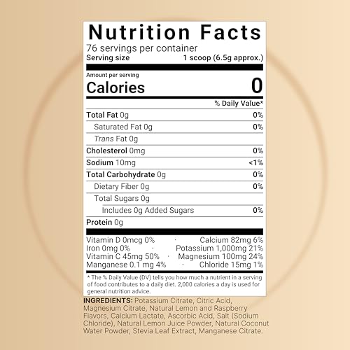 Cada porção deste pó de eletrólitos fornece um alto nível de 1.000mg de potássio, além de conter cálcio, magnésio e sal. Além disso, é combinado com suco de limão real e água de coco para obter benefícios máximos. Essa combinação de ingredientes ajuda a repor os eletrólitos perdidos durante a atividade física intensa ou em situações de desidratação.