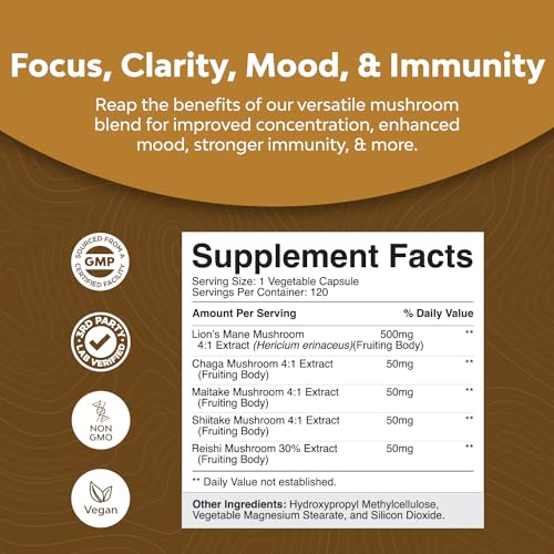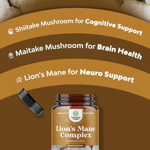 Suplemento Avançado de Cogumelo Lion’s Mane – Cápsulas de Suplemento de Lion’s Mane com Complexo de 5X Corpo Frutífero de Cogumelo com Chaga Maitake Shiitake e Reishi – Estimulante Cerebral Nootrópico