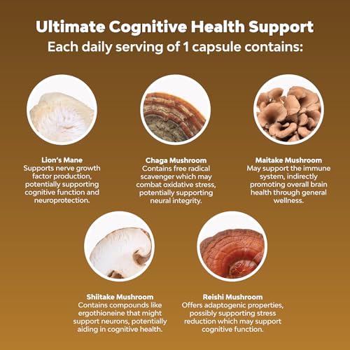 Além de melhorar a função cerebral, essas cápsulas também são excelentes para a saúde da memória e do foco. A combinação de Lion’s Mane, Chaga, Maitake, Shiitake e Reishi cria um poderoso complexo de cogumelos que fornece suporte nutricional para o cérebro, ajudando a melhorar a concentração, a memória e a capacidade de aprendizado.