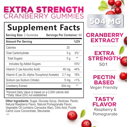 1. Suporte Potente ao Trato Urinário: Com uma fórmula de triplo forte, essas gomas de cranberry oferecem um suporte incomparável à saúde do trato urinário, ajudando a prevenir infecções e promovendo a saúde geral dessa região.