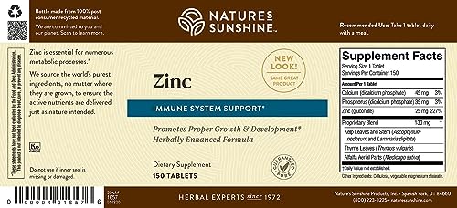 O Nature’s Sunshine Zinc 25mg, 150 Tablets é um suplemento alimentar que ajuda a fortalecer o sistema imunológico, fornecendo 167% do valor diário de zinco. Cada comprimido contém 25 miligramas de zinco, um mineral traço essencial para o funcionamento adequado do corpo. O zinco desempenha centenas de funções importantes no organismo, incluindo o metabolismo do açúcar, a formação do DNA, o metabolismo das proteínas e a produção de energia.