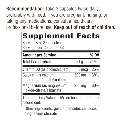 Para obter os melhores resultados, é recomendado que adultos tomem 3 cápsulas do Nature’s Way Calcium-Magnesium-Vitamin D3 duas vezes ao dia, preferencialmente com alimentos. Consulte um profissional de saúde antes de iniciar qualquer suplementação.