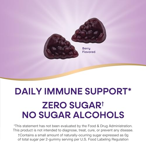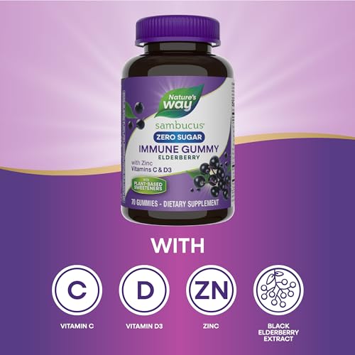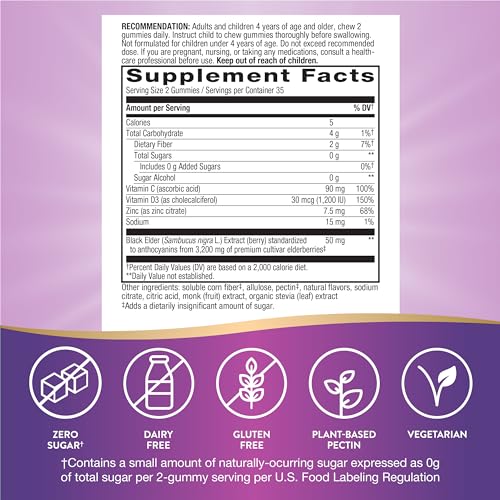 As Gomas Imunes Nature’s Way Sambucus Zero Sugar são uma excelente opção para apoiar a saúde do sistema imunológico diariamente. Elas são feitas com vitaminas C e D3 de alta potência e são uma excelente fonte de zinco, que ajudam a fortalecer o sistema imunológico.* Cada porção de 2 gomas contém uma pequena quantidade de açúcar natural, expressa como 0 g de açúcar total, de acordo com as regulamentações de rotulagem de alimentos dos Estados Unidos.