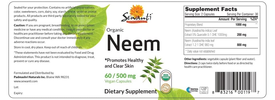 As cápsulas de Neem Sewanti são um suplemento herbal de alta potência, formulado para promover a saúde da pele. Com propriedades purificadoras e ricas em antioxidantes, o Neem fortalece as defesas naturais do corpo, proporcionando suporte imunológico. Além disso, o Neem é conhecido por promover a saúde da pele, ajudando a manter uma pele clara e saudável de dentro para fora. O Neem também auxilia na função digestiva e na saúde intestinal, contribuindo para o bem-estar geral. Além disso, o Neem ajuda a desintoxicar o corpo, eliminando toxinas e apoiando os processos de desintoxicação e limpeza. Cada cápsula é vegana e contém 500mg de extrato orgânico de Neem, oferecendo uma maneira conveniente de incorporar os benefícios do Neem em sua rotina diária.