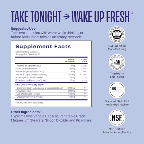 TAKE WHILE CELEBRATING – DHM Detox é a vitamina para quando você bebe. Ele ajuda a impulsionar a reação natural do seu corpo ao álcool e fornece ingredientes vitais (nutrientes, antioxidantes e vitaminas) para ajudá-lo a estar no seu melhor no dia seguinte. Projetado para ser tomado durante a ingestão de bebidas ou antes de dormir.