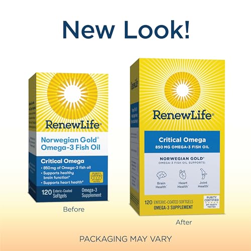 Renew Life Norwegian Gold Critical Omega Softgels é um suplemento diário de ômega-3 em cápsulas, que suporta a saúde do coração, cérebro e articulações. Cada frasco contém 120 cápsulas de 850 mg de óleo de peixe ômega-3, que é altamente concentrado em ácidos graxos ômega-3 para ajudar a adicionar esse nutriente essencial à sua rotina diária. A fórmula dessas cápsulas é livre de refluxo, graças à presença de lipase, proporcionando uma experiência sem sabor residual de peixe e melhor digestão e absorção dos ácidos graxos ômega-3. Cada porção dessas cápsulas contém 850 mg de EPA e DHA, que são ácidos graxos ômega-3 essenciais para a saúde do coração e do organismo em geral. Além disso, essas cápsulas também ajudam no desenvolvimento cerebral e na saúde geral. Elas são testadas e formuladas por terceiros, com a certificação de pureza máxima de 5 estrelas pelo Programa Internacional de Padrões de Óleo de Peixe (IFOS). A cobertura entérica garante que cada cápsula de óleo de peixe alcance seu trato intestinal, garantindo potência, qualidade e pureza até a data de validade. Para obter os melhores resultados, recomenda-se tomar uma cápsula por dia, com ou sem alimentos, ou conforme orientação do seu profissional de saúde. Este suplemento de óleo de peixe é livre de glúten e laticínios, sendo formulado com ingredientes de alta qualidade de origem global. A Renew Life é uma marca comprometida com a saúde e o bem-estar, com mais de 25 anos de experiência em ensaios clínicos.