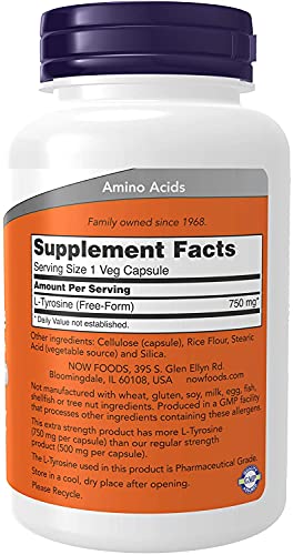 Cada cápsula contém 750 mg de L-Tyrosine, fornecendo uma dose potente para ajudar a otimizar a função cerebral. Este suplemento é formulado com ingredientes de alta qualidade e é livre de ingredientes artificiais, glúten, trigo, leite, ovos e soja, tornando-o adequado para pessoas com restrições alimentares ou sensibilidades.