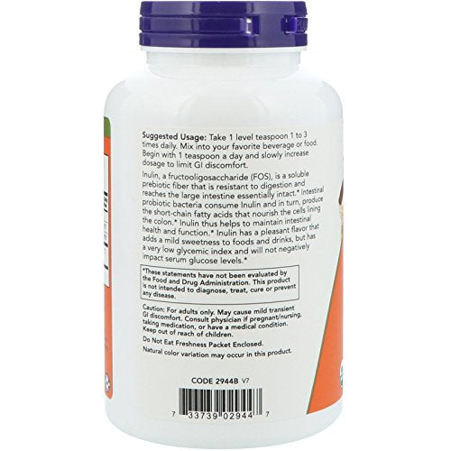 Recomenda-se tomar 1 colher de chá (2,8g) de NOW Inulin Prebiotic Fos uma ou duas vezes ao dia. Misture em água, suco ou adiciona a alimentos como iogurte, cereais ou smoothies. Consulte um profissional de saúde antes de iniciar qualquer suplementação.
