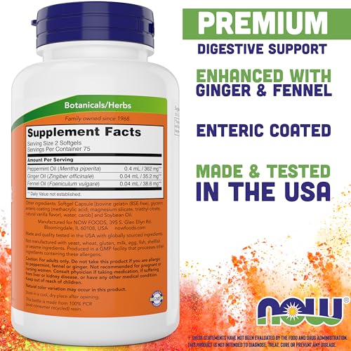 Para obter os melhores resultados, recomenda-se tomar de 1 a 2 cápsulas de gel dos NOW Peppermint Gels com óleo de gengibre e óleo de erva-doce, de 1 a 3 vezes ao dia, 30 minutos antes das refeições. Essas cápsulas são revestidas com um revestimento entérico especial, portanto, certifique-se de não mastigá-las, pois isso pode comprometer sua eficácia. Consulte um profissional de saúde antes de iniciar qualquer suplemento alimentar.