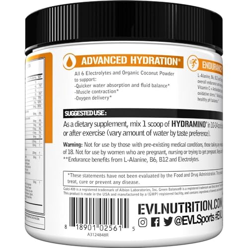 O Evlution Nutrition HYDRAMINO Complete Hydration Multiplier é uma fórmula completa e rápida de hidratação que fornece todos os 6 eletrólitos essenciais, além de aminoácidos-chave que aumentam os fluidos nas células. Com água de coco hidratante, vegetais alcalinizantes, antioxidantes naturais e vitaminas B e C, este produto mantém você em movimento!