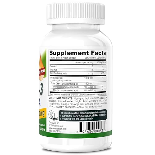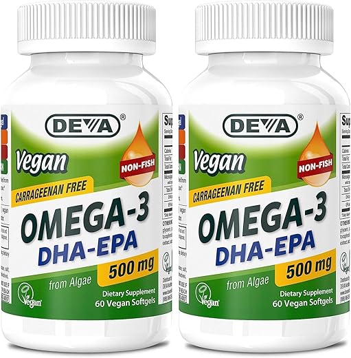DEVA Vegan Omega-3 DHA EPA Supplement – Once-Per-Day Softgel 500 MG – Carrageenan Free – Gelatin Free – Non-Fish – Algae Oil Omega-3 Fatty Acids – 60 Softgels (Pack of 2)
