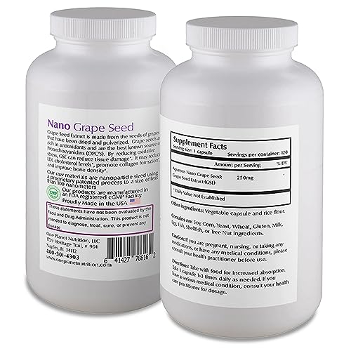 Vitaminas: Cada frasco da One Planet Nutrition contém 120 cápsulas de 250 mg de extrato de semente de uva. Nosso Nano Extrato de Semente de Uva foi reduzido a nanopartículas (tamanho de 1-100 nm). Não utilizamos nenhum enchimento em nenhum de nossos produtos.