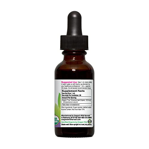 Oregon’s Wild Harvest Cinnamon 1:2 Organic Herbal Supplement, 1 Fluid Ounce é um suplemento herbal orgânico certificado pelo USDA, 100% vegetariano e produzido pela Oregon Tilth. Este extrato de canela é livre de excipientes, estearatos e ligantes, garantindo uma fórmula pura e de alta qualidade. Além disso, não contém alérgenos como laticínios, trigo, amendoim, soja ou milho.