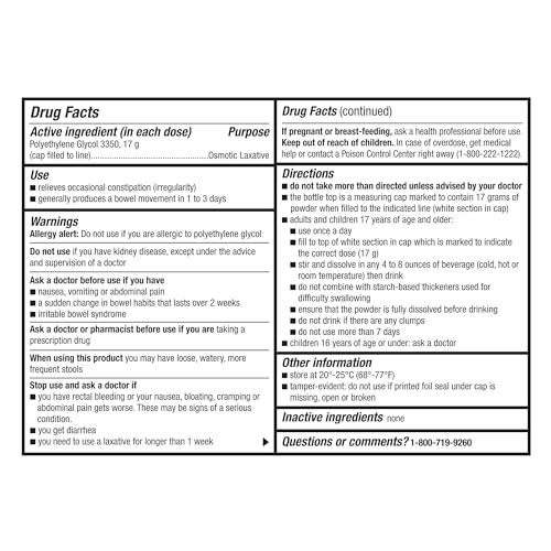 O GoodSense Polyethylene Glycol 3350 Powder for Solution é um laxante osmótico que proporciona alívio para a constipação ocasional e irregularidade intestinal. Com o ingrediente ativo Polietileno Glicol 3350, este laxante age aumentando a frequência dos movimentos intestinais e amolecendo as fezes, promovendo uma evacuação mais confortável. Comparado ao ingrediente ativo do MiraLAX, este produto oferece uma alternativa eficaz e acessível para o tratamento da constipação.