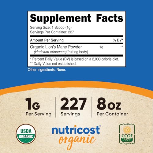 O Nutricost Organic Lion’s Mane Mushroom Powder é um suplemento alimentar certificado pela USDA, feito a partir do pó orgânico do cogumelo Lion’s Mane. Este produto é livre de glúten, vegetariano e não contém organismos geneticamente modificados (OGM). Cada recipiente contém 227 porções, com uma porção de 1g de pó de Lion’s Mane orgânico (colher inclusa).