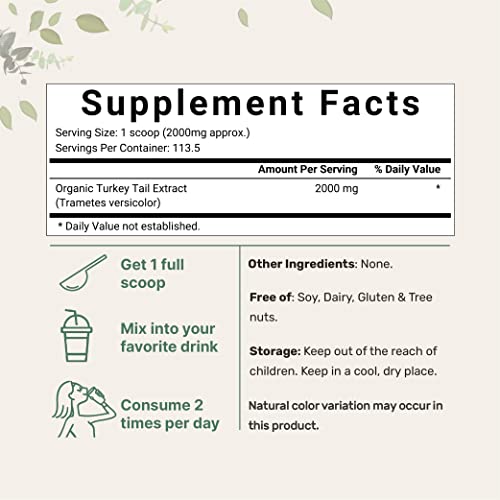 Para obter os melhores resultados, recomenda-se misturar uma colher de chá do pó de cogumelo turkey tail em água, suco ou adicioná-lo a smoothies e receitas. Consuma uma vez ao dia ou conforme orientação de um profissional de saúde.