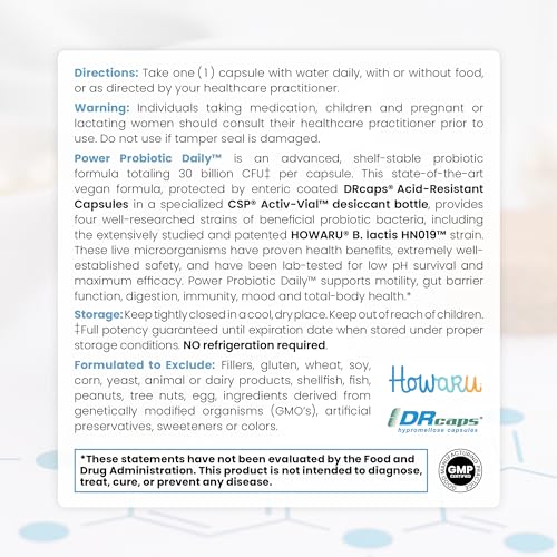 FÓRMULA POTENTE: 30 Bilhões de UFC por cápsula vegetal. Quatro cepas de bactérias benéficas pesquisadas – HOWARU (*Bifidobacterium lactis HN019, Lactobacillus acidophilus (Lactobacillus acidophilus La-14), Lactobacillus plantarum (Lactobacillus plantarum Lp-115), Bifidobacterium longum (Bifidobacterium longum Bl-05) *inclui a cepa HN019 de Bifidobacterium lactis extensivamente estudada.