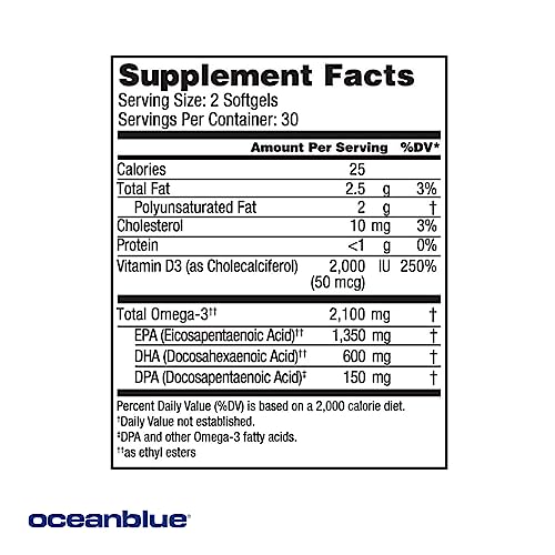 O OceanBlue Professional Omega-3 2100 é um suplemento de óleo de peixe sem refluxo e com sabor de baunilha, que oferece uma potente combinação de EPA, DHA, DPA e vitamina D3. Com uma fórmula de tripla força, cada cápsula fornece 1.350 mg de EPA, 600 mg de DHA e 150 mg de DPA, provenientes de óleo de peixe selvagem capturado em águas cristalinas e certificado como sustentável pela Friend of the Sea.