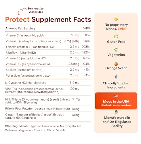 Ingredientes poderosos: Nossas cápsulas para o fígado contêm ingredientes poderosos como cisteína, extrato de cardo mariano, extrato de gengibre, DHM, vitamina C, vitamina E, vitamina B1, vitamina B2, vitamina B6, potássio e muito mais. Não há necessidade de um suplemento separado de gengibre ou cápsulas de cardo mariano quando você tem tudo o que precisa no Cheers Protect.
