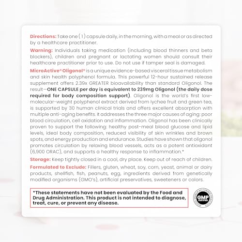 COMPROVADO CLINICAMENTE: Cada cápsula de MicroActive Oligonol fornece no mínimo 100mg de MicroActive Oligonol para suportar os resultados desejados de níveis saudáveis de tecido visceral, composição corporal magra, níveis saudáveis de glicose e lipídios pós-refeição, saúde da pele, circulação e produção de energia. Apoiado por 30 ensaios clínicos em humanos, bem como décadas de pesquisa, basta tomar uma pequena cápsula diariamente.