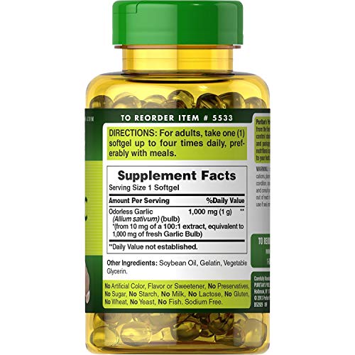 O Pack de 4 Puritan’s Pride Odorless Garlic 1000 mg, 250 Softgels é um suplemento alimentar que oferece diversos benefícios para a saúde. Este produto é formulado com alho inodoro de alta qualidade, que suporta níveis saudáveis de colesterol e fornece suporte antioxidante para o coração. Além disso, ajuda a manter uma circulação saudável. O alho promove a saúde do coração e do sistema cardiovascular, além de auxiliar na manutenção dos níveis de colesterol que já estão dentro da faixa normal. O método especializado de processamento a frio preserva as propriedades naturais do alho, ao mesmo tempo em que reduz o odor característico.