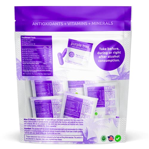 Tome 2 comprimidos de Purple Tree com água antes, durante ou imediatamente após o consumo responsável de bebidas alcoólicas. Não exceda a dose recomendada. Consulte um profissional de saúde antes de usar se estiver grávida, amamentando ou tiver alguma condição médica. Mantenha fora do alcance de crianças.