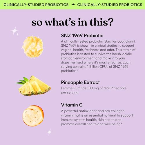 SUPPORTS FEMININE HEALTH: Lemme Purr é um inovador probiótico em formato de goma de mascar formulado para apoiar a saúde vaginal, frescor, odor e níveis saudáveis de pH com 1 bilhão de UFCs da cepa probiótica SNZ-1969, estudada clinicamente. Além disso, contém vitamina C antioxidante e 100 mg de abacaxi real por porção.*