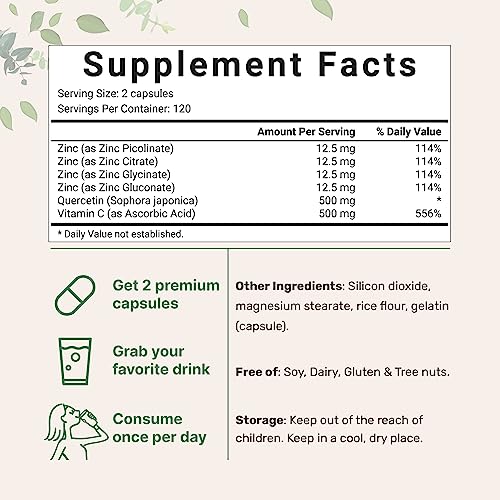 Cada embalagem contém 240 cápsulas no total, com 120 porções e um tamanho de porção de 2 cápsulas. Isso oferece um complexo de zinco 50mg de picolinato, citrato, glicinato e gluconato, além de quercetina 500mg como sophora japonica e vitamina C 500mg como ácido ascórbico.