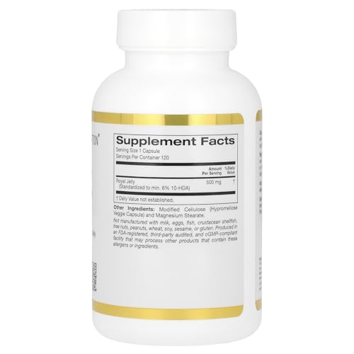 O California Gold Nutrition Royal Jelly é um suplemento alimentar de alta qualidade que contém 500 mg de geleia real em cada cápsula vegetal. A geleia real é uma substância produzida pelas abelhas e é conhecida por ser rica em nutrientes essenciais, incluindo vitaminas, minerais e aminoácidos. Cada cápsula deste produto é equivalente a 1500 mg de geleia real fresca, garantindo uma dose potente e eficaz.