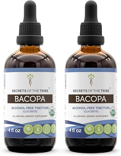 Os Segredos da Tribo Bacopa USDA Organic | Extrato Livre de Álcool, Gotas de Ervas de Alta Potência | Feito a partir de 100%% de Erva Seca de Bacopa (Bacopa Monnieri) Certificada Organic (2×4 oz) é um produto de alta qualidade que oferece uma série de benefícios para a saúde. Nossos produtos possuem a certificação USDA Organic, o que significa que eles atendem a rigorosos padrões estabelecidos pelo Programa Nacional Orgânico em relação ao cultivo, processamento e manuseio. Além disso, eles são testados por laboratórios independentes para garantir a ausência de substâncias estranhas e preenchedores, confirmando a identificação das ervas para sua segurança. Nossos produtos são 100%% naturais, sem adição de cores ou sabores artificiais, açúcar ou adoçantes, e são facilmente absorvidos pelo corpo. Eles também são testados e verificados quanto à pureza, sendo destilados a vapor para garantir uma qualidade impecável. Além disso, eles são livres de glúten, conservantes, soja, laticínios, ovos e crueldade animal. Com nosso método de extração exclusivo e patenteado, garantimos a mais alta concentração de componentes bioativos. E o melhor de tudo, nossos produtos são 100%% fabricados nos EUA.