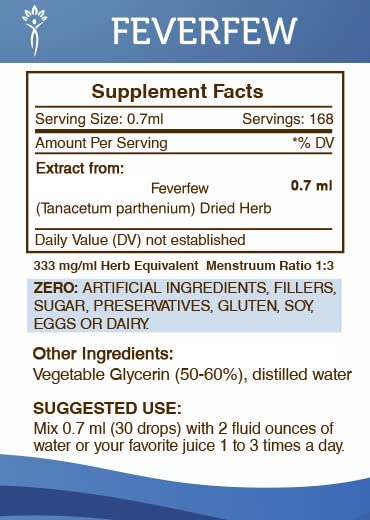 A Tintura de Feverfew da Secrets of the Tribe é um extrato líquido sem álcool feito a partir da erva seca de Feverfew (Tanacetum parthenium). Este produto é testado por laboratórios independentes de terceiros para garantir a ausência de substâncias estranhas e preenchedores, além de confirmar a identificação da erva para sua segurança. Sua pureza é testada e verificada através de destilação a vapor, garantindo uma qualidade impecável. Além disso, é livre de glúten, conservantes, soja, laticínios, ovos e crueldade animal.