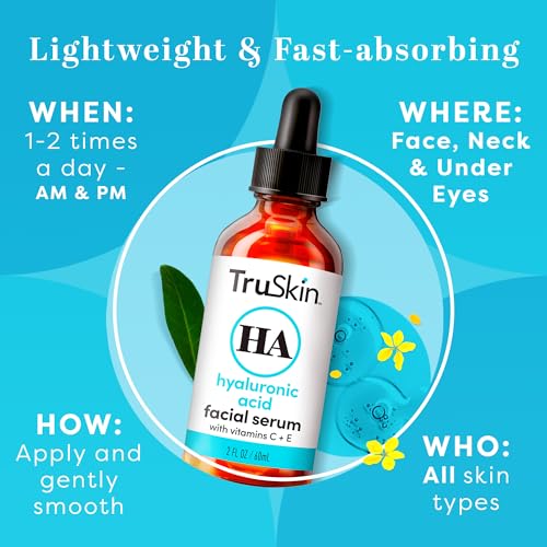 TruSkin Naturals, Hyaluronic Acid Serum for Face 7 Ultra Hydrating Ingredients é um poderoso soro hidratante formulado para suavizar suavemente as linhas finas e rugas, ao mesmo tempo que promove uma firmeza, textura e tom melhorados. Este soro é ideal para ser aplicado antes do seu hidratante TruSkin favorito para maximizar a hidratação e os resultados.