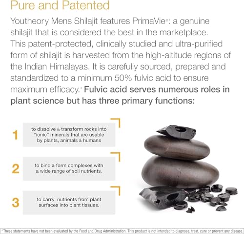 Suplemento autêntico de Shilajit para homens: As cápsulas de Shilajit da Youtheory fornecem 250 mg de shilajit para apoiar a resistência e a resistência masculina, já dentro de uma faixa saudável*