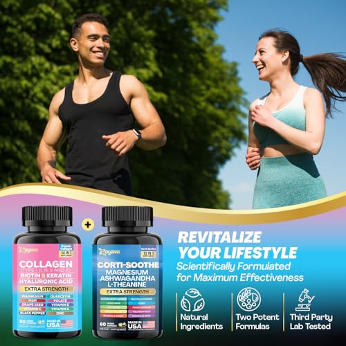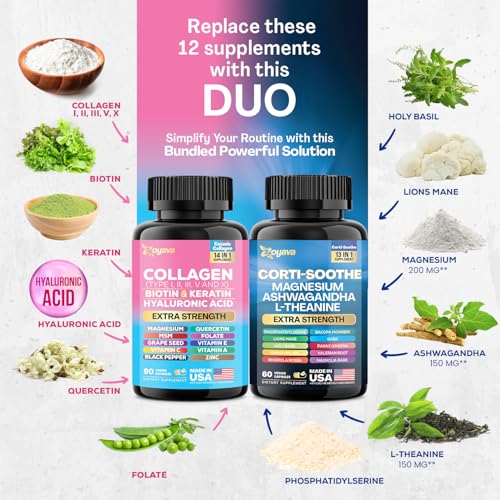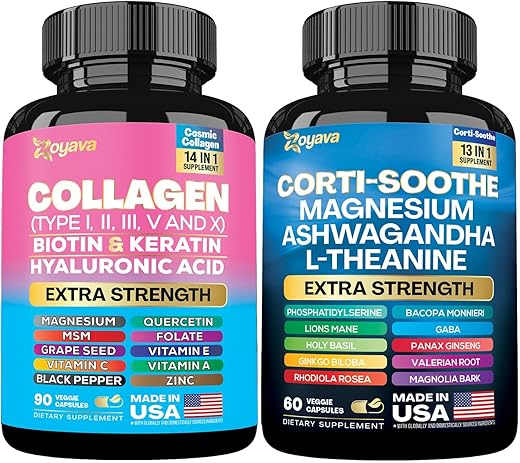 Eleve seu bem-estar com o Duo Harmonia e Radiância da Zoyava, uma poderosa combinação de suporte ao cortisol e colágeno. Essa fórmula dinâmica, com 27 ingredientes premium, combina sem esforço Ashwagandha, Magnésio, L-Theanine, Lions Mane e um Complexo de Colágeno Tipos I, II, III, V, X com Biotina, Ácido Hialurônico e muito mais, para um bem-estar abrangente.
