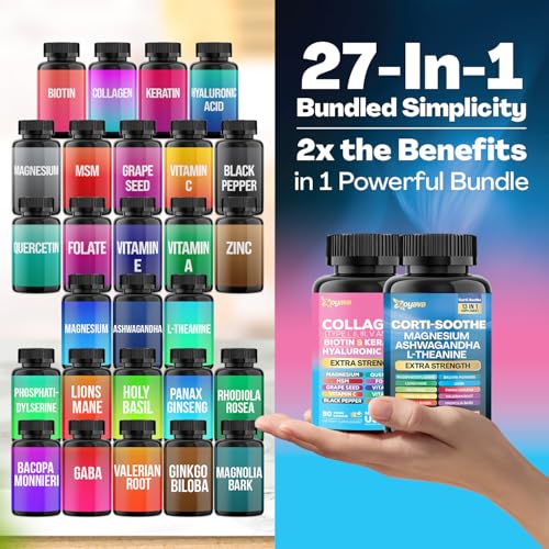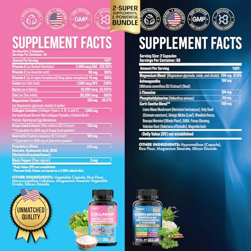 Desbloqueie os benefícios das fórmulas de suporte ao cortisol 13 em 1 e colágeno 14 em 1, convenientemente embaladas em dois frascos separados. Essa combinação cuidadosa oferece ingredientes-chave como Ashwagandha, L-Theanine, Magnésio, Biotina e Ácido Hialurônico, garantindo uma nutrição completa sem comprometer.