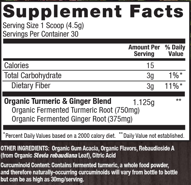 Formulado usando a antiga arte da fermentação, este suplemento de cúrcuma e gengibre é facilmente digerível e fornece a forma mais densa em nutrientes e biodisponível de ervas botânicas possíveis. Além disso, possui apenas 15 calorias por porção e é livre de açúcar, tornando-o uma opção saudável para adicionar a shakes e smoothies.