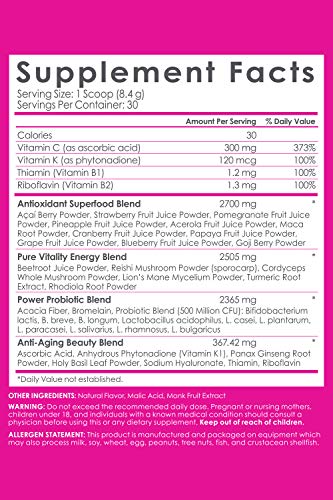 YOUTHFUL, RADIANT SKIN. Os antioxidantes do Beauty Juice ajudam a suavizar e iluminar a pele envelhecida de dentro para fora! Apenas uma deliciosa porção de Beauty Juice pode ajudar a reverter os sinais de envelhecimento, deixando você se sentindo confiante e bonita.