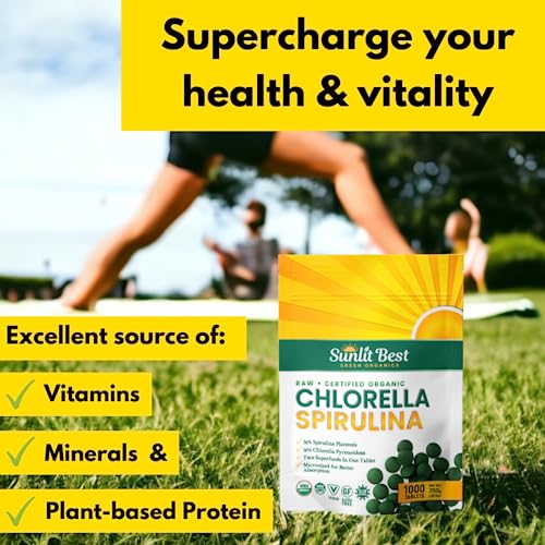 ORGANIC SUPERFOOD FOR OPTIMAL HEALTH: Nossos potentes comprimidos de superalimentos naturais nutrem suas células para ajudar a aumentar os níveis de energia, apoiar um sistema imunológico forte, remover toxinas do seu corpo, reduzir a inflamação e ajudar na digestão. Os comprimidos de Chlorella Spirulina Sunlit Best Organic Burst são uma parte integrante da remoção do seu corpo, regime de beleza natural e estilo de vida saudável e energético em geral.