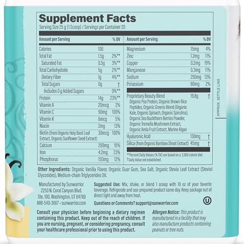 – Sugestão de Uso: Para obter os melhores resultados, misture 1 colher de sopa do Pó de Proteína de Colágeno Vegano da Sunwarrior com 10 oz da sua bebida preferida. Pode ser adicionado a shakes de proteína, café, leite de amêndoa ou água. Consuma diariamente para promover a produção de colágeno e desfrutar dos benefícios para a saúde.