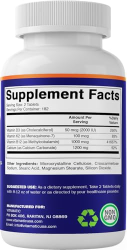 O Suplemento de Cálcio Vitamatic 1200mg com D3, K2 é uma fórmula abrangente que combina ingredientes de alta qualidade para promover a saúde óssea e fortalecer o sistema imunológico. Cada comprimido contém 1200mg de cálcio, 2000UI de vitamina D3, 100mcg de vitamina K2 e 1000mcg de vitamina B12 (metilcobalamina).