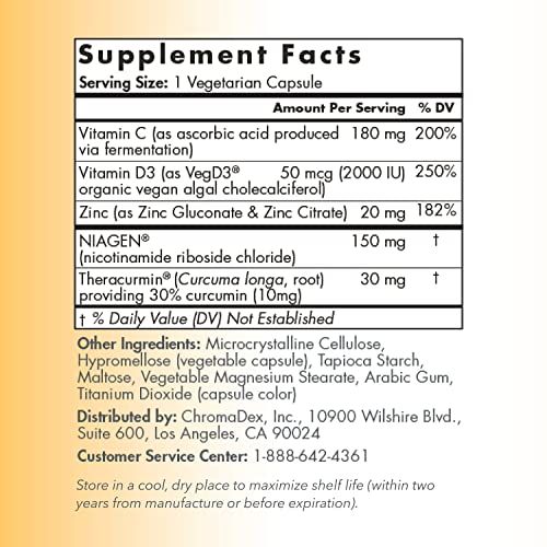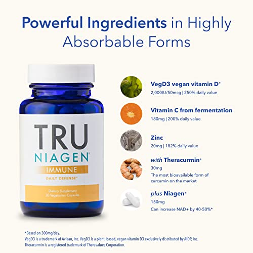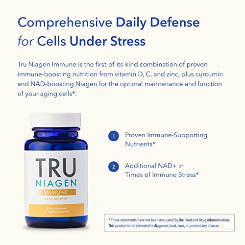 Tru Niagen Immune Support Supplement – Daily Defense – Vitamin C from Fermentation, Vegan Vitamin D3 2000 IU, Zinc, Plus Theracurmin (Curcumin) Multi Award-Winning NAD é um suplemento projetado para abordar a conexão entre a idade e a saúde imunológica. À medida que envelhecemos, nosso sistema imunológico passa por mudanças que podem afetar nossa saúde. Tru Niagen Immune é o primeiro suplemento desse tipo que contém ingredientes que suportam o envelhecimento saudável em nível celular profundo e ingredientes comprovados para a defesa do sistema imunológico.