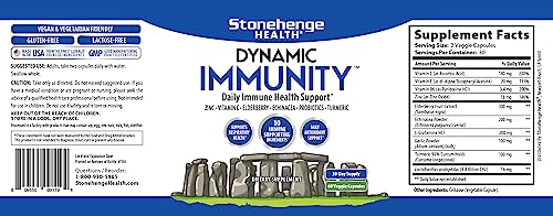 🛡️ COMPREHENSIVE DAILY IMMUNE SYSTEM SUPPORT: O Stonehenge Health Dynamic Immunity Daily Supplement é uma fórmula poderosa que oferece suporte abrangente ao sistema imunológico. Com 10 ingredientes potentes, como Elderberry, Echinacea, Vitaminas, Probióticos e outros nutrientes vitais, este suplemento é ideal para fortalecer o sistema imunológico e manter um estilo de vida ativo.