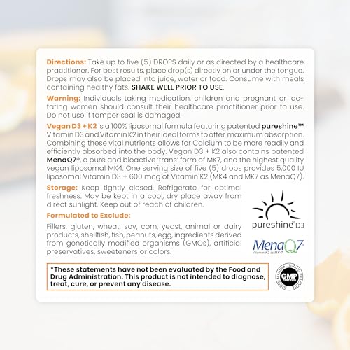 Recomenda-se tomar cinco gotas do suplemento por dia, que fornecem 5.000 UI de vitamina D3 lipossomal e 600 mcg de vitamina K2 (MK4 e MK7 como MenaQ7). Agite bem antes de usar. Consulte um profissional de saúde antes de iniciar qualquer suplementação.