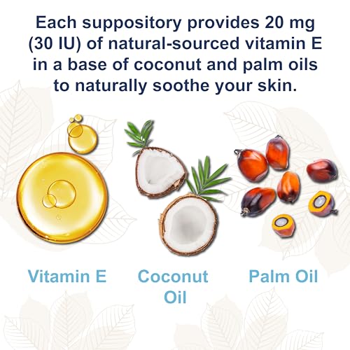 Cada supositório Key-E da Carlson contém 30 UI de vitamina E para ajudar a acalmar e curar áreas secas e sensíveis.